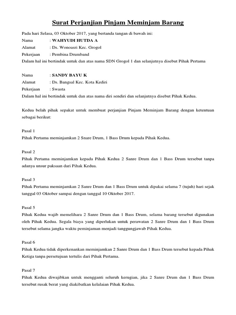Surat Perjanjian Pinjam Meminjam Barang. Ayat 2 Mengenai perjanjian ini dan segala akibatnya kedua belah pihak bersepakat untuk memilih domisili yang tetap pada ----- Kantor. Contoh surat rasmi pinjaman wang lamaran r.